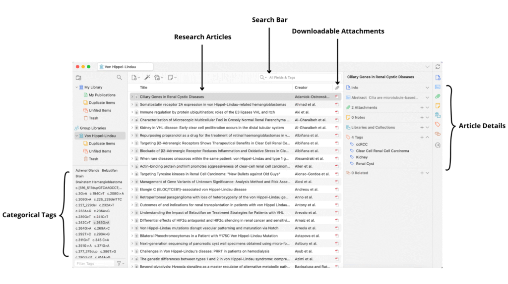 Explore our curated database of Von Hippel-Lindau (VHL) research papers, designed to support patients, families, researchers, and healthcare professionals. You can access the full collection directly on the Zotero platform by clicking the button below.