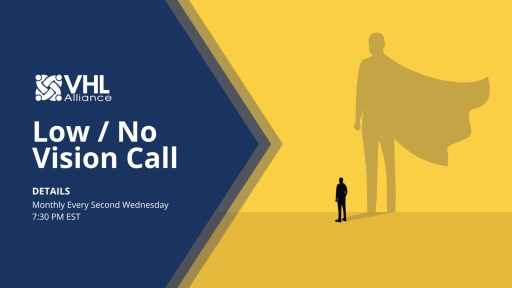 Living with low or no vision creates unique challenges for VHL patients. The Low/No Vision Monthly Discussion Call is specifically designed for support and sharing of important tips and resources.